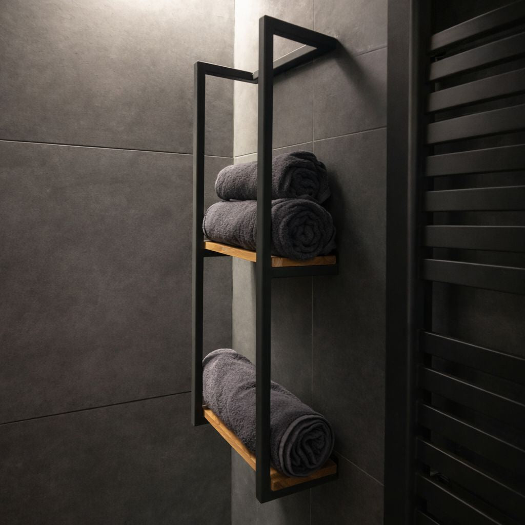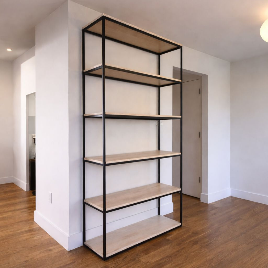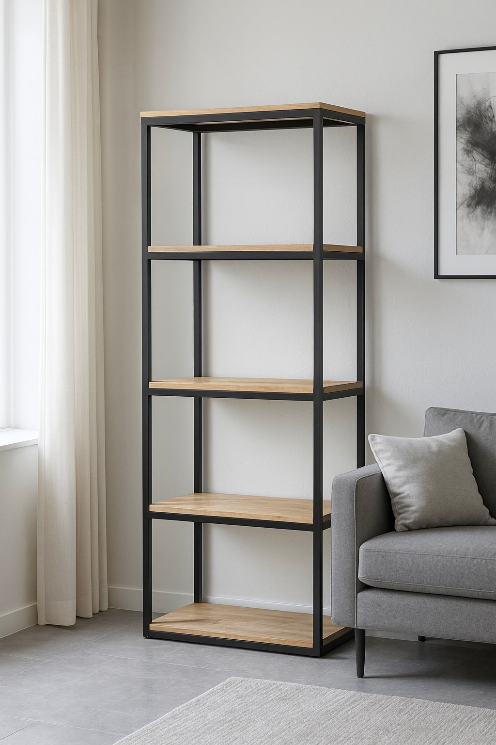 Estantería de estilo industrial con estructura de acero en negro y baldas de madera. Diseño robusto y elegante, perfecta para organizar y decorar espacios modernos con carácter